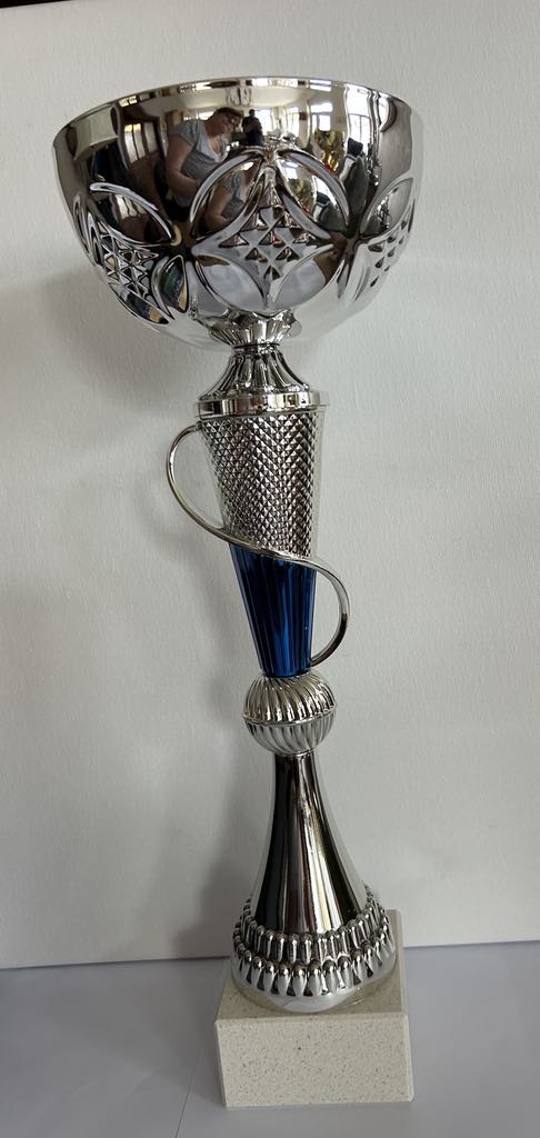 Coupe Trophée argent et bleu .Disponible en 3 tailles