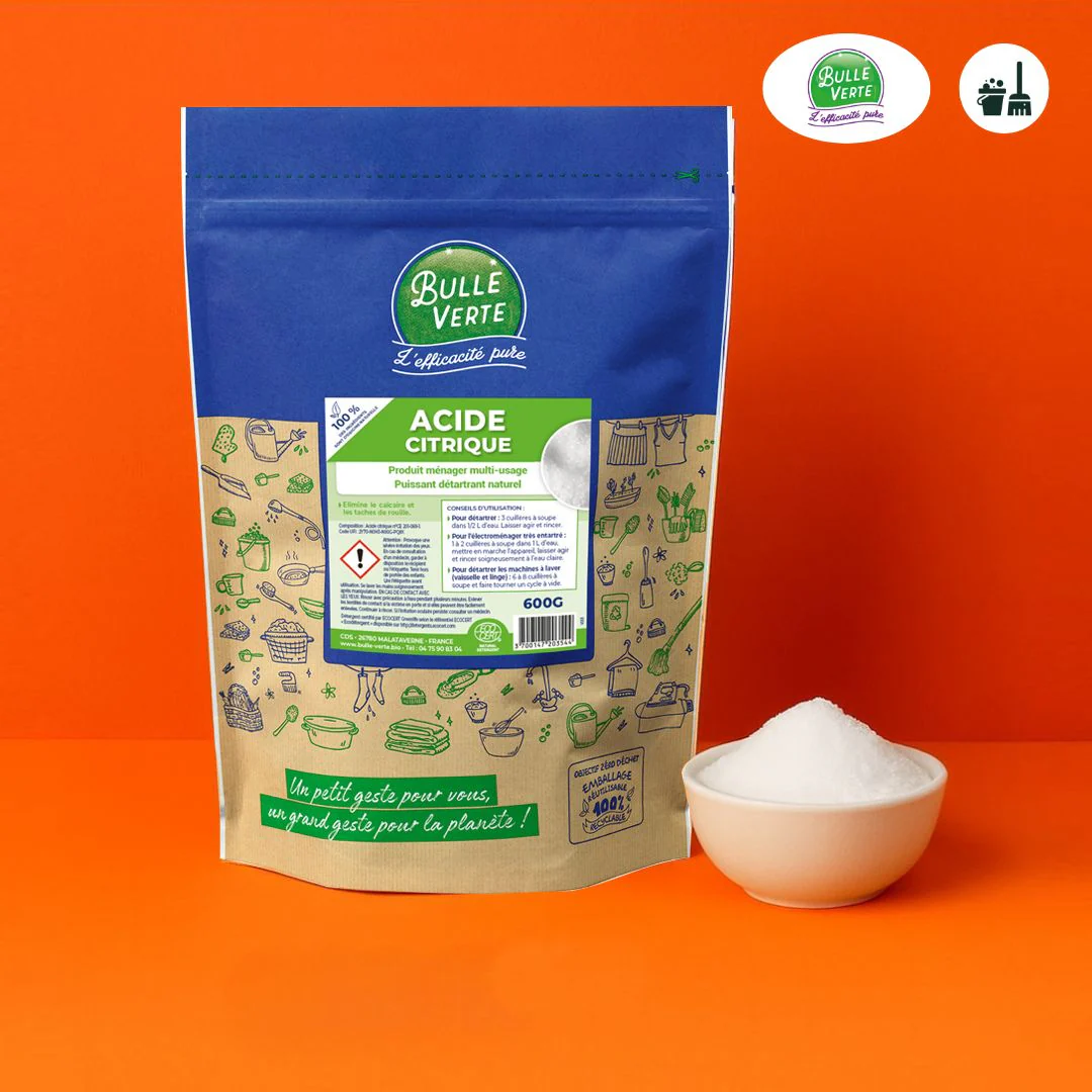 L’Acide Citrique 600g Bulle Verte est un détartrant et antioxydant naturel multi-usage, idéal pour nettoyer les surfaces et machines entartrées ainsi que les taches tenaces (rouille, thé, brûlé). Biodégradable et sans odeur, il est certifié ECOCERT et non testé sur les animaux.