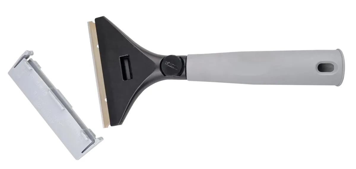Sa largeur de travail 10 cm offre un bon rendement sur les zones étendues, tout en restant assez précise pour intervenir le long des bords et dans les zones difficiles. La molette de serrage verrouille la lame fermement : la coupe reste stable pendant l’action, ce qui améliore la sécurité et la qualité de finition. Le changement de lame est simple et rapide, pratique en vitrerie comme en entretien des sols.