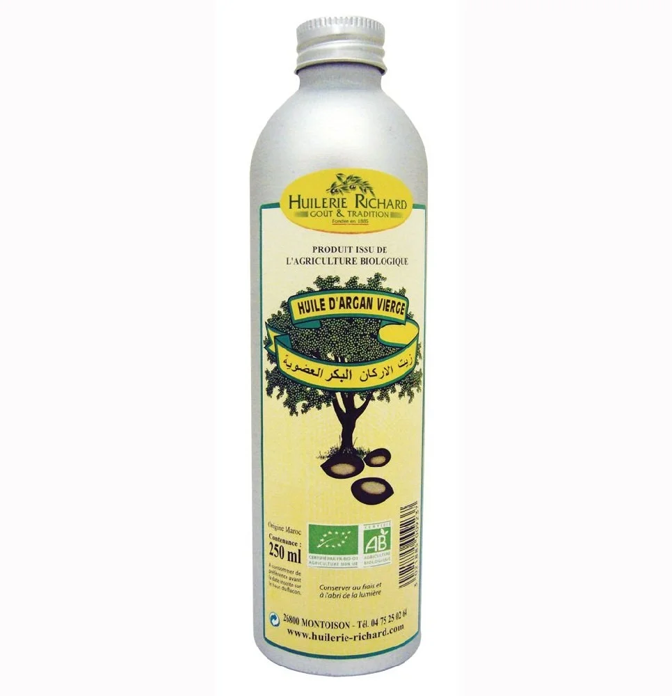 Cette huile vierge biologique est issue d’une pression à froid des fruits de l’Arganier (aussi appelés les arganes). L’Arganier est un arbre qui pousse en abondance et à l’état sauvage dans les zones arides et semi-arides du Sud-Ouest marocain. Notre huile d’Argan est conditionnée par nos soins dans un élégant flacon en aluminium opaque. Ce dernier est recyclable et évite l’oxydation de l’huile. L’huile d’argan bio que nous vous proposons a fait l’objet de contrôles rigoureux, du ramassage des arganes jusqu’à son conditionnement.