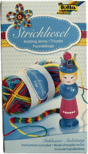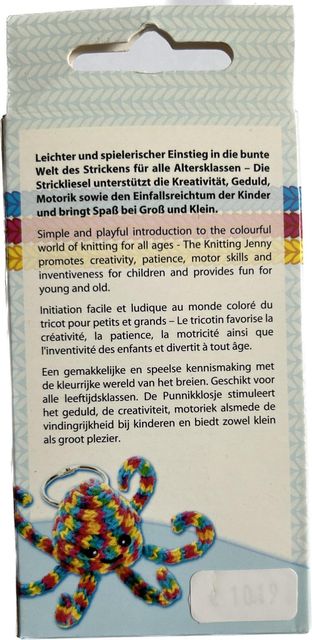 Contenu: tricotin, laine à tricoter 25 gr, aiguille à tricoter, aiguille et instructions